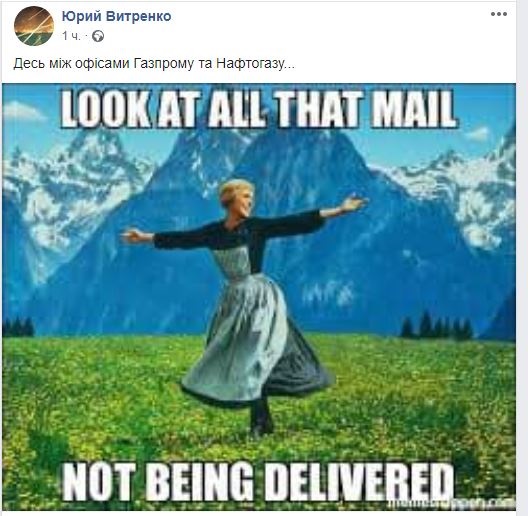 На странице в Facebook исполнительный директор НАК Юрий Витренко опубликовал картинку с подписью «look at all that mail not being delivered», озаглавив ее «где-то между офисами Газпрома и Нафтогаза.