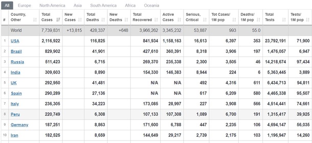 Всего в мире коронавирусом заразились 7 739 831 человек, 428 337 заболевших скончались, 3 966 262 человека — выздоровели.