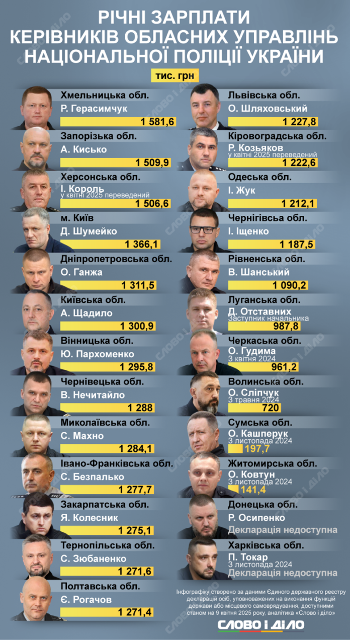 Менше всіх заробили керівники обласних управлінь поліції, які пропрацювали неповний рік. Олег Гудима був призначений головою Нацполіції Черкаської області у квітні 2024 року, йому нарахували 961,2 тисяч гривень зарплати.