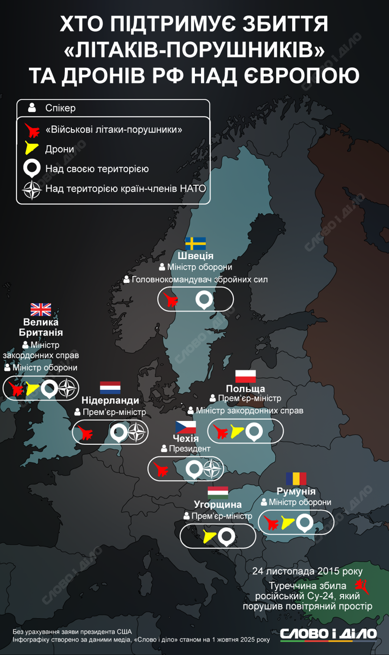 Низка європейських країн заявили про готовність збивати «невідомі» дрони або літаки-порушники повітряного простору, як це зробила у листопаді 2015 року Туреччина. Тоді турецькі винищувачі F-16 збили військовий літак рф поблизу сирійського кордону після того, як він порушив повітряний простір країни протягом п’яти хвилин і не відреагував на численні попередження. Водночас росія наполягала, що літак весь час перебував над територією Сирії. На тлі інцидентів з дронами у небі Європи та прольотами винищувачів рф, «Слово і діло» вирішило подивитись, хто підтримує збиття безпілотників та військових літаків над Європою у разі порушення повітряного простору.