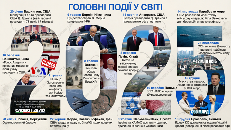 Одна з важливих подій, зокрема для України та її можливостей продовжувати оборону проти рф, сталася під кінець року – лідери країн ЄС у Брюсселі погодилися надати кредит у 90 млрд євро. Київ зможе повернути ці гроші вже після того, як росія виплатить репарації. Якими ще важливими подіями на світовому рівні відзначився 2025 рік – можна згадати на інфографіці «Слово і діло».