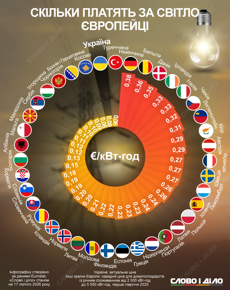 Дані для європейських країн наведені за перше півріччя 2025 року – це середня ціна для домогосподарств із річним споживанням від 2 500 до 5 000 кВт-год за інформацією Eurostat. Для України вказано актуальний тариф.