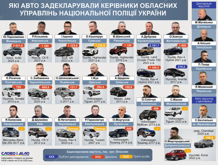 - начальник ГУНП Рівненської області Віктор Шанський (Toyota Highlander 2019 року, 1 мільйон 100 тисяч грн);