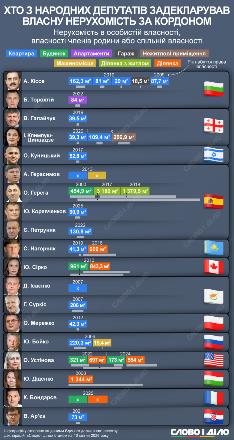 Своєю чергою депутат від «Слуги народу» Олександр Куницький, який ще у 2024 році поїхав у відрядження в США й досі не повернувся, володіє нерухомістю площею 52,8 кв. м в Ізраїлі, громадянство якого він має. Дружина Костянтина Бондарєва з «Батьківщини», якого НАБУ підозрює у сприянні незаконному перетину кордону, з 2025 року володіє будинком і земельною ділянкою у Франції.