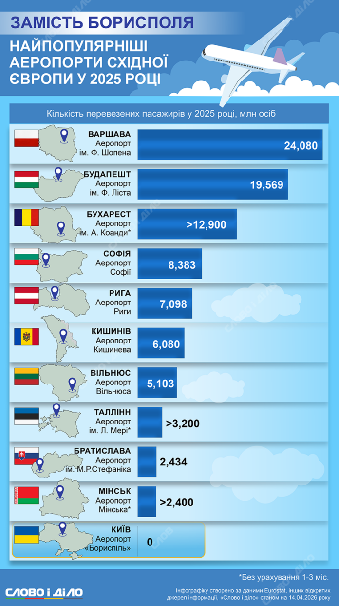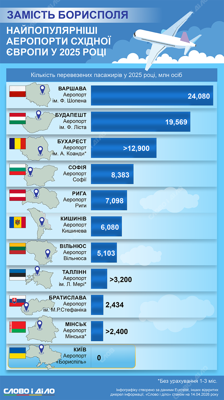 Повномасштабне російське вторгнення на невизначений час зупинило роботу українських аеропортів. Попри регулярні згадки у медіа про підготовку авіакомпаній до відновлення сполучення у разі перемир’я, Україні доводиться покладатися на летовища найближчих сусідів у Європі, насамперед Польщі, Молдови та Угорщини. Аналітики «Слово і діло» порахували, скільки пасажирів пройшло через найбільші аеропорти Східної Європи у 2025 році.