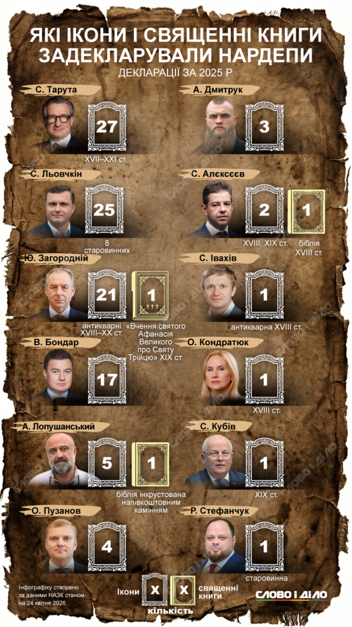 Депутат від «Батьківщини» Сергій Тарута зберігає у себе вдома 27 ікон, член депутатської групи «Платформа за життя та мир» (колишня ОПЗЖ) Сергій Льовочкін – 25. У позафракційного Юрія Загороднього, окрім ікон, є книга з вченням святого Афанасія, а депутат від «Євросолідарності» Андрій Лопушанський задекларував Біблію, інкрустовану напівкоштовним камінням. Хто ще з нардепів згадав ікони та релігійні книги у своїх деклараціях – на інфографіці slovoidilo.